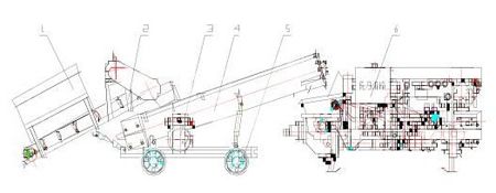 本攪拌機為便于運輸及存放,采用分體式結構。水泥輸送帶、沙子輸送帶、細石輸送帶為一部件,螺旋攪拌為一部件。為便于活動以上各部件都裝有拖輪或滾輪。運輸時攪拌機構放下支腿使導軌輪離地即可裝車運輸。