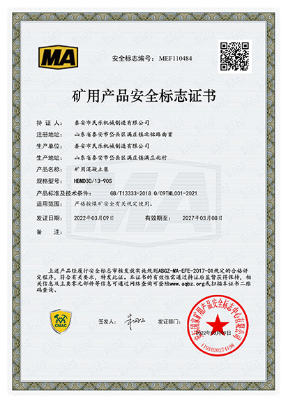 熱烈慶祝我廠礦用混凝土輸送泵通過煤安安全標(biāo)志證書(煤安編號(hào):MEF110483、MEF110484、MEF110485)。目前公司成功研制出HBMD15/6-22S混凝土輸送泵、以下簡稱“15立方混凝土泵”,且在銷售市場俏銷的形勢下乘勝前進(jìn),又試機(jī)成功**款新型的高壓大輸送量混凝土輸送泵HBMD30/13-90S混凝土輸送泵、HBMD80/16-110S混凝土輸送泵,目前已成功申辦“煤安標(biāo)志”,把產(chǎn)品推向市場。